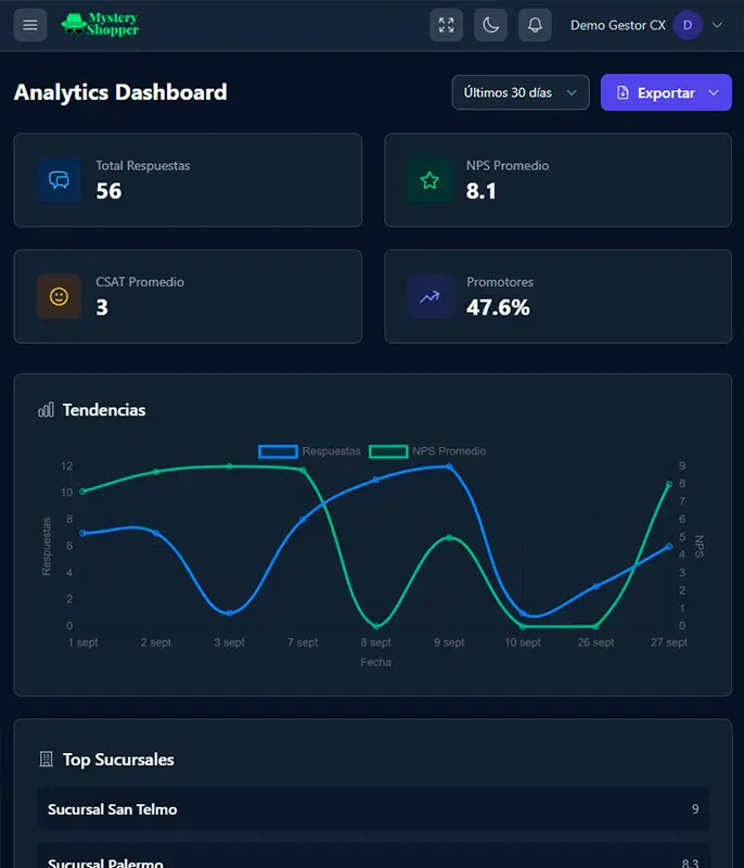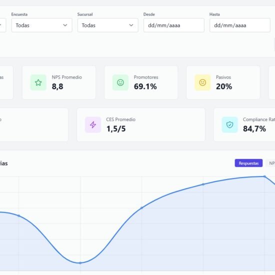 Visualice los indicadores más importantes de su negocio —NPS, CSAT, cumplimiento de auditorías y reclamos. Compare resultados entre sucursales, fechas o regiones y observe tendencias de desempeño sin esperar reportes de fin de mes.